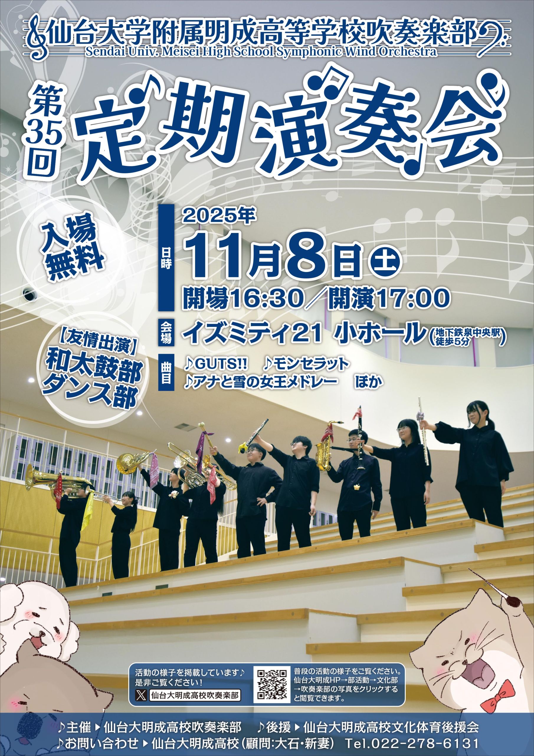 仙台大学附属 明成高等学校吹奏楽部 第35回定期演奏会 開催日 2025年11月8日(土曜) 開催時間 17:00開演(16:30開場) 会場 小ホール 料金 入場無料 問い合わせ 仙台大学附属 明成高等学校(大石・新妻) 022-278-6131 関連リンク 仙台大学附属 明成高等学校 最新のイベント一覧 月別のイベント一覧 2026年3月のイベント 2026年2月のイベント 2026年1月のイベント 2025年12月のイベント 2025年11月のイベント 2025年10月のイベント 2025年9月のイベント 2025年8月のイベント 2025年7月のイベント 2025年6月のイベント 2025年5月のイベント 2025年4月のイベント 2025年3月のイベント 2025年2月のイベント 2025年1月のイベント イベントの検索
