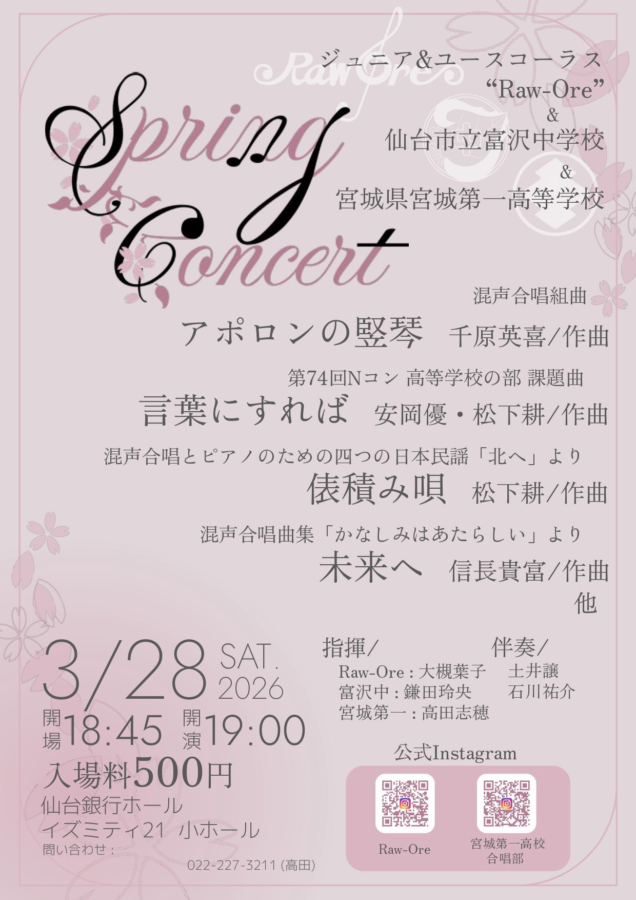 スプリングコンサート 宮一合唱部×富沢中合唱部דRaw-Ore” 開催日 2026年3月28日(土曜) 開催時間 19:00開演(18:45開場) 会場 小ホール 料金 500円 当日券販売あり プレイガイド 各団体部員、団員から直接購入 問い合わせ ジュニア&ユースコーラス“Raw-Ore” 090-2026-4382 raw_ore2006@yahoo.co.jp 宮城第一高等学校(高田) 022-227-3211 関連リンク “Raw-Ore” Instagram 宮城第一高校合唱部公式Instagram 最新のイベント一覧 月別のイベント一覧 2026年5月のイベント 2026年4月のイベント 2026年3月のイベント 2026年2月のイベント 2026年1月のイベント 2025年12月のイベント 2025年11月のイベント 2025年10月のイベント 2025年9月のイベント 2025年8月のイベント 2025年7月のイベント 2025年6月のイベント 2025年5月のイベント 2025年4月のイベント 2025年3月のイベント 2025年2月のイベント 2025年1月のイベント イベントの検索